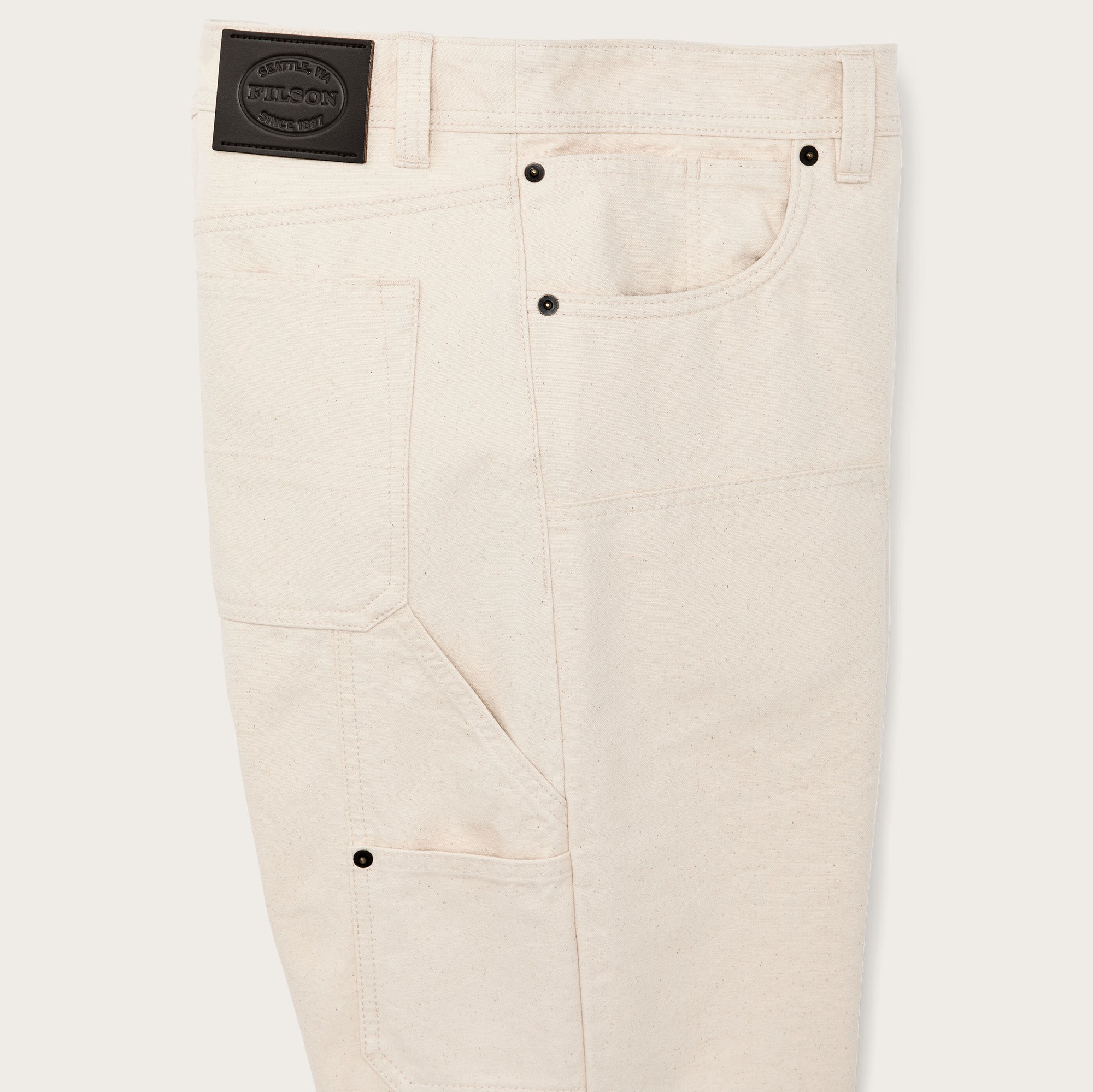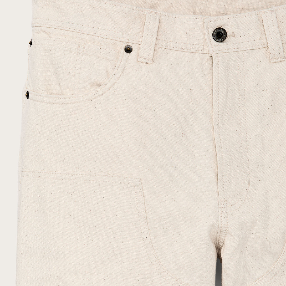 Werkzeugtaschen am rechten Bein halten die Ausrüstung griffbereit. Verstärkte Taschenböden widerstehen dauerhaft der Belastung durch Messer, Maßbänder und Werkzeuge. Abgerundet mit einem Metallknopf mit Schaft am Bund sowie einem stabilen Reißverschluss.
