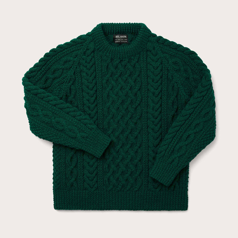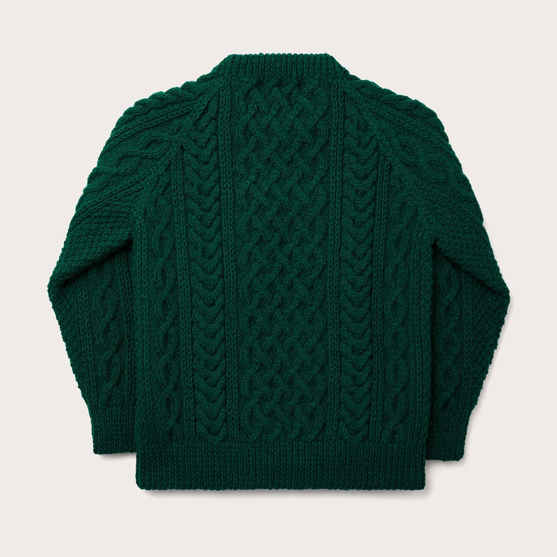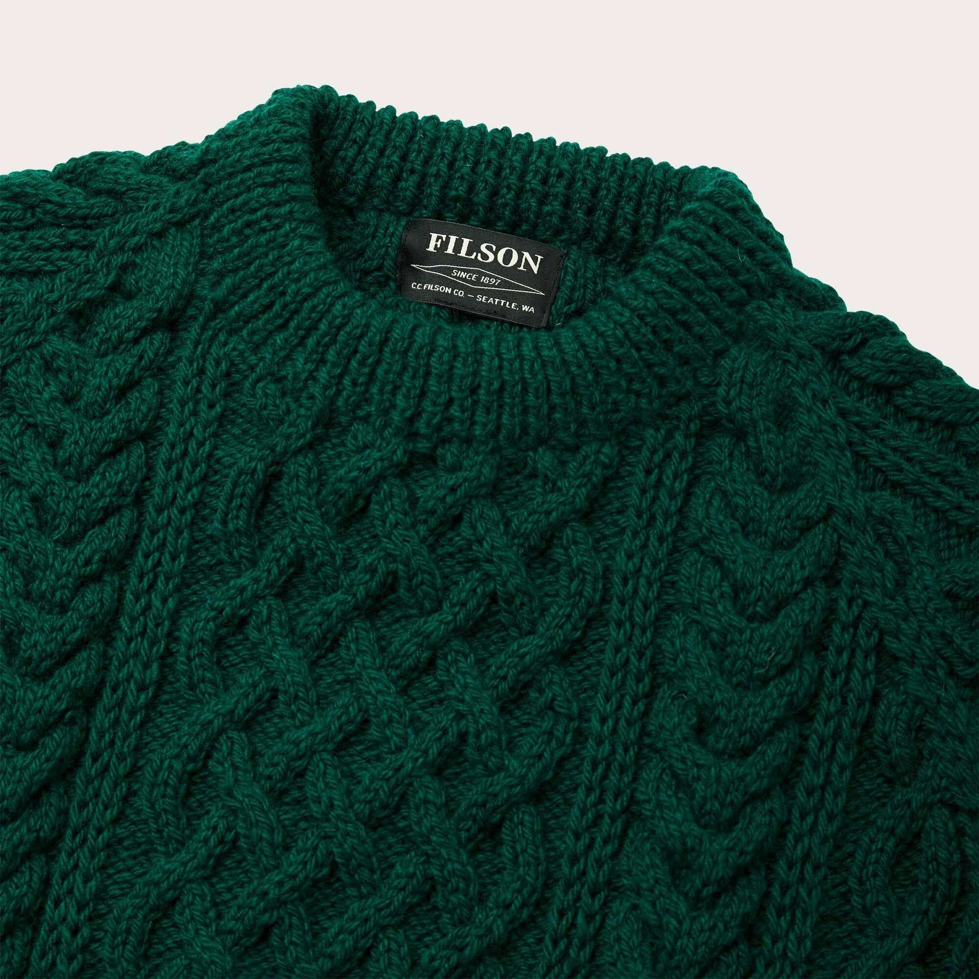Unser Wool Fisherman's Sweater ist dick und warm - gefertigt aus derselben schottischen Wolle, die schon Generationen von Fischern vor dem rauen Wetter im Nordatlantik geschützt hat. Die 100 %ige Schurwolle isoliert, auch wenn sie durchnässt wird. Handgestrickt mit verschiedenen Zopfmustern in einem jahrhundertealten Stil. Kragen, Manschetten und Saum aus Rippstrick