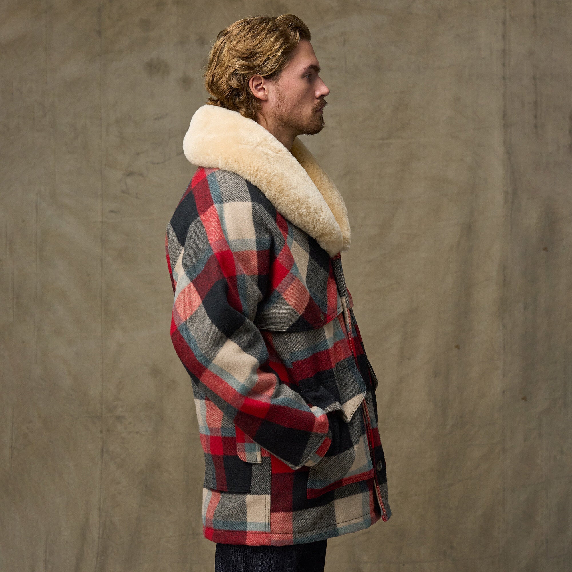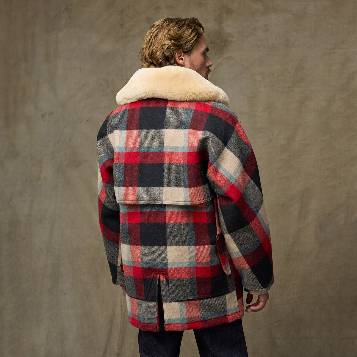 100 % laine Mackinaw 680 g + 100 % flanelle de coton 227 g + sergé de polyester + shearling en peau de mouton d’Australie/Nouvelle-Zélande