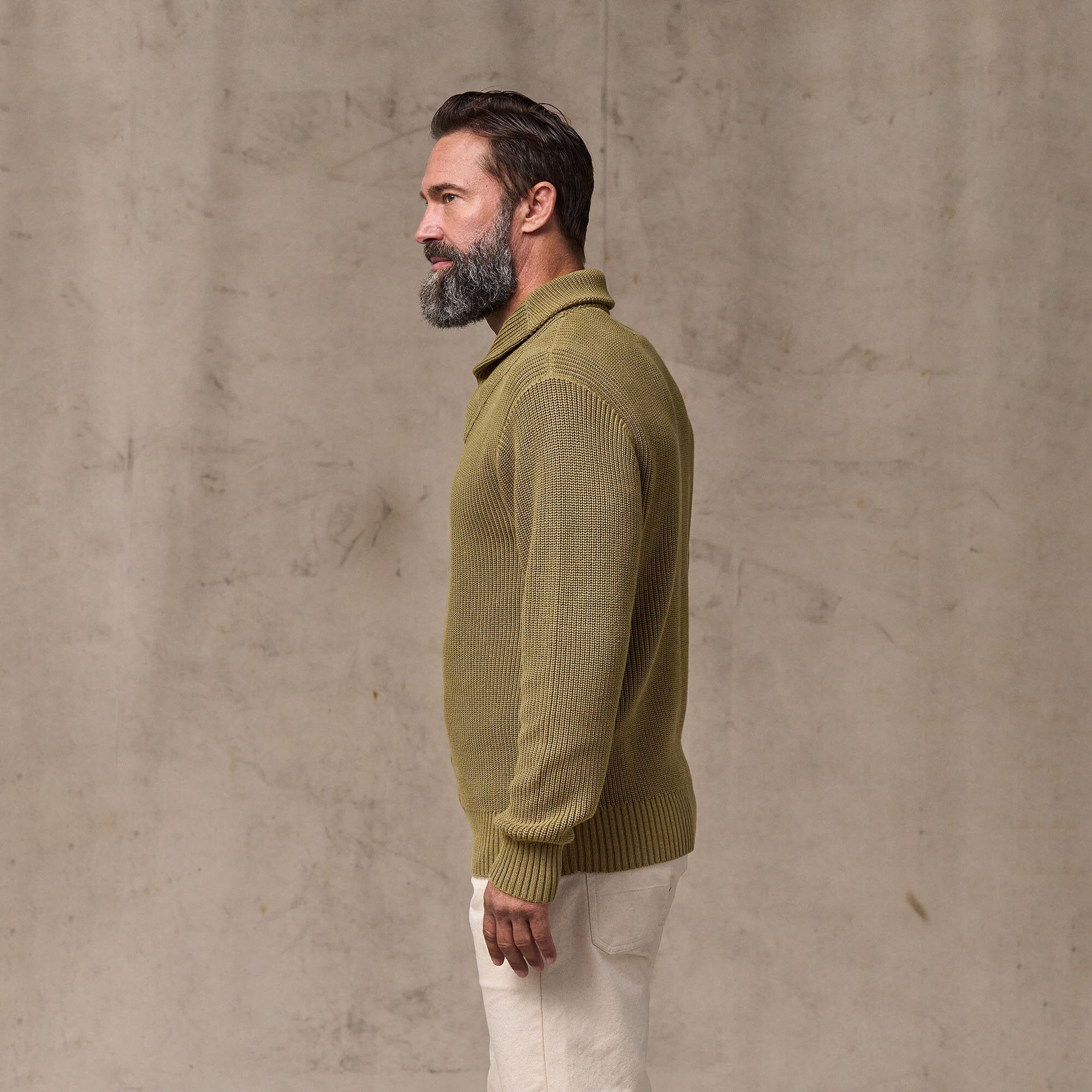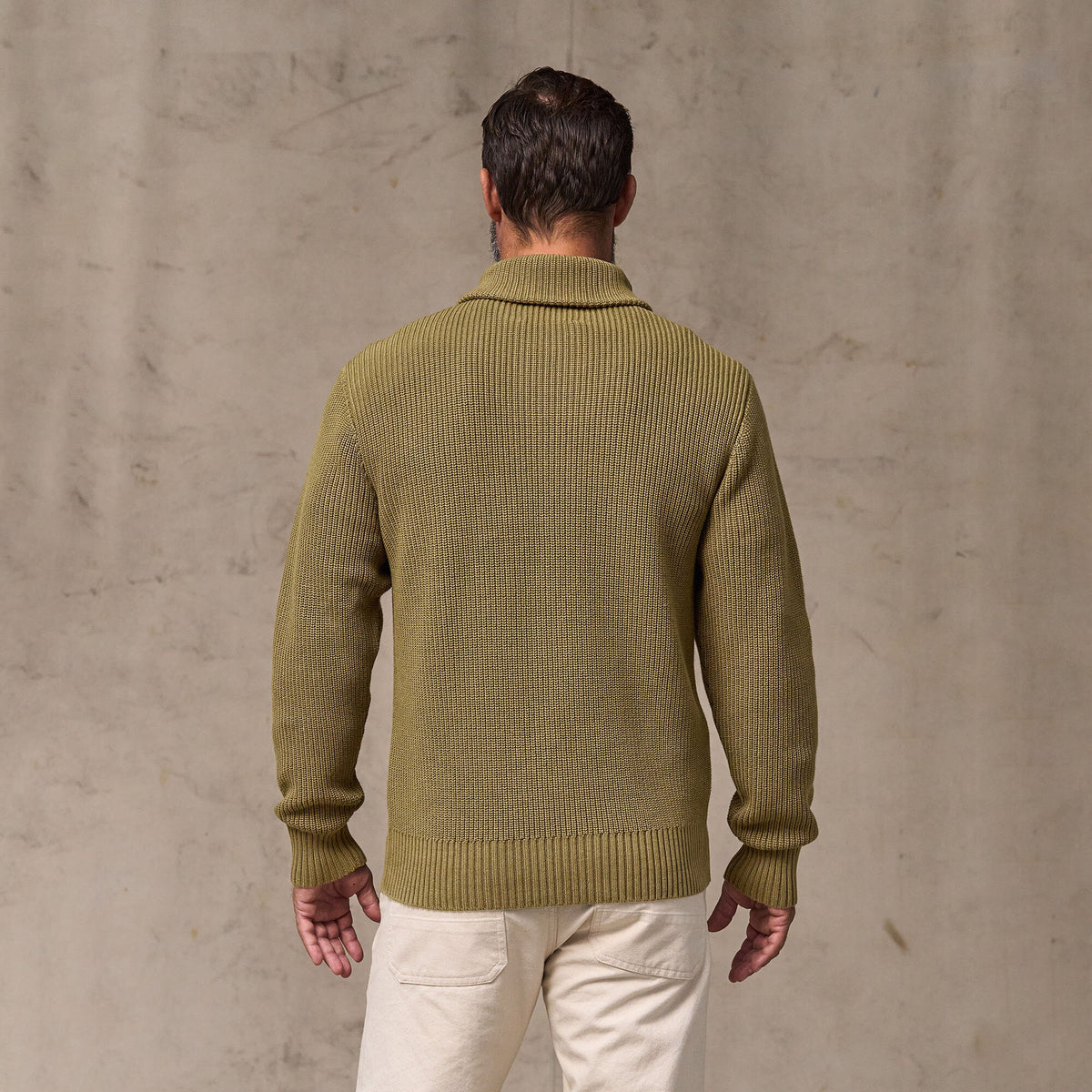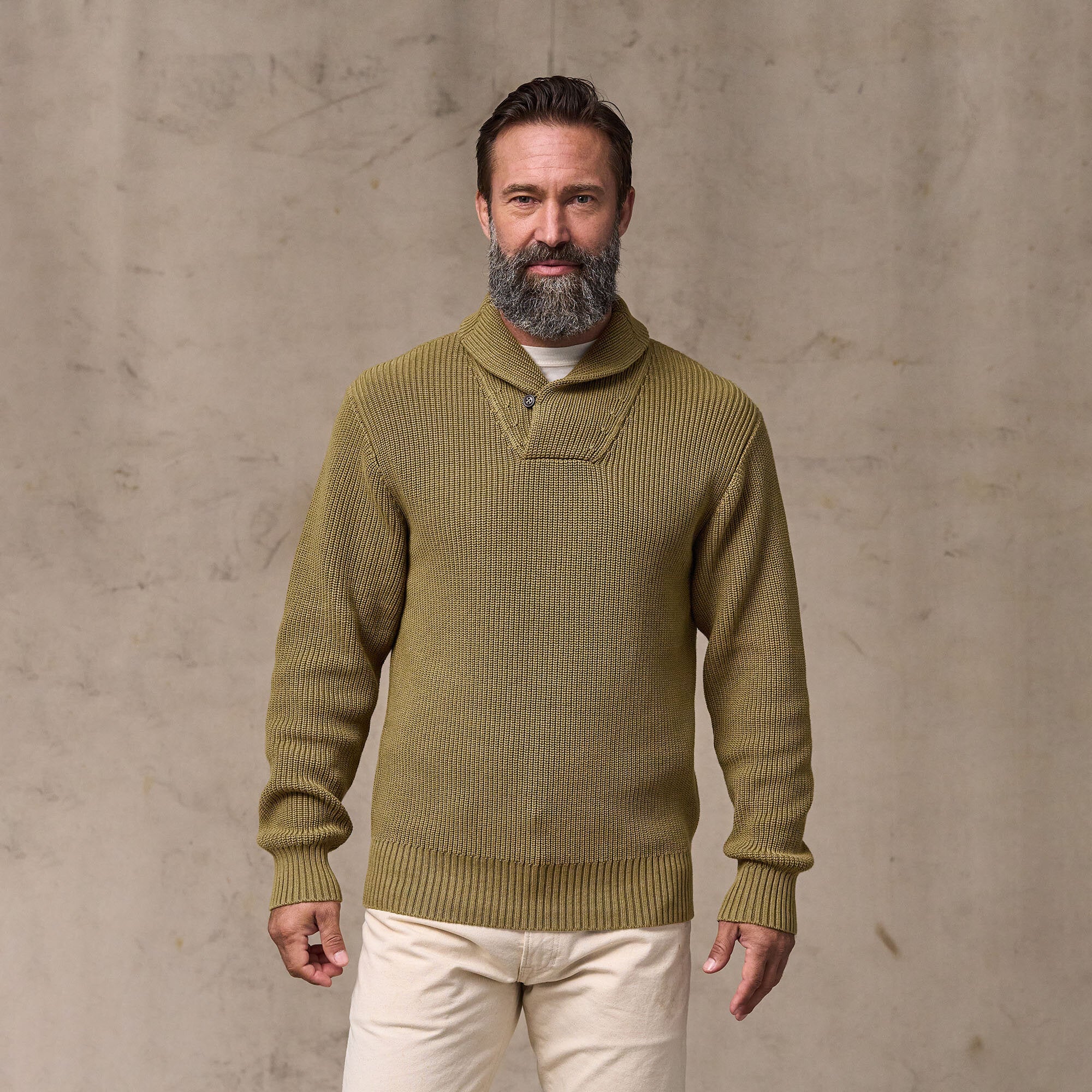 Ce pull intemporel à col châle offre une chaleur respirante par temps frais. Le col châle peut être relevé pour plus de chaleur au niveau du cou. Les fils de jauge 7 sont travaillés en côte perlée qui est à la fois ajourée et souple. Poignets et ourlet en point de côtes 2 x 2. Vêtement lavé en pièce pour une sensation de vêtement déjà porté dès le premier jour, avec un aspect vintage unique à chaque pull.