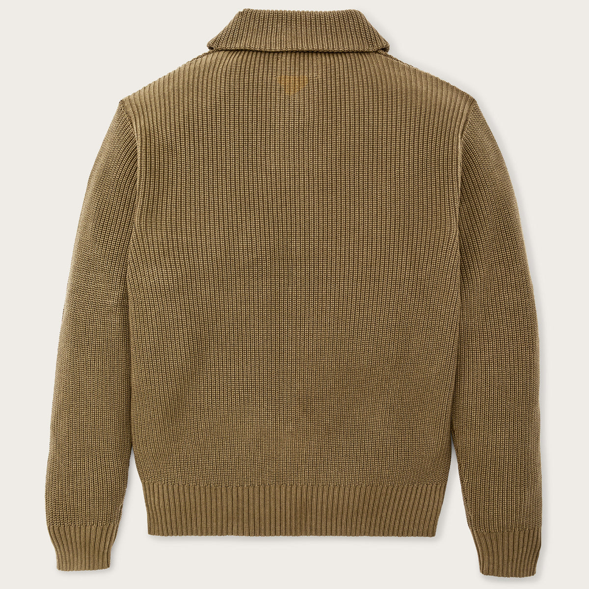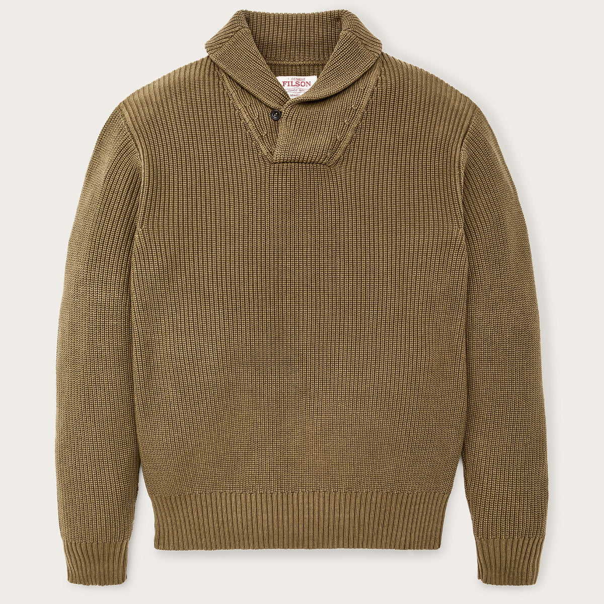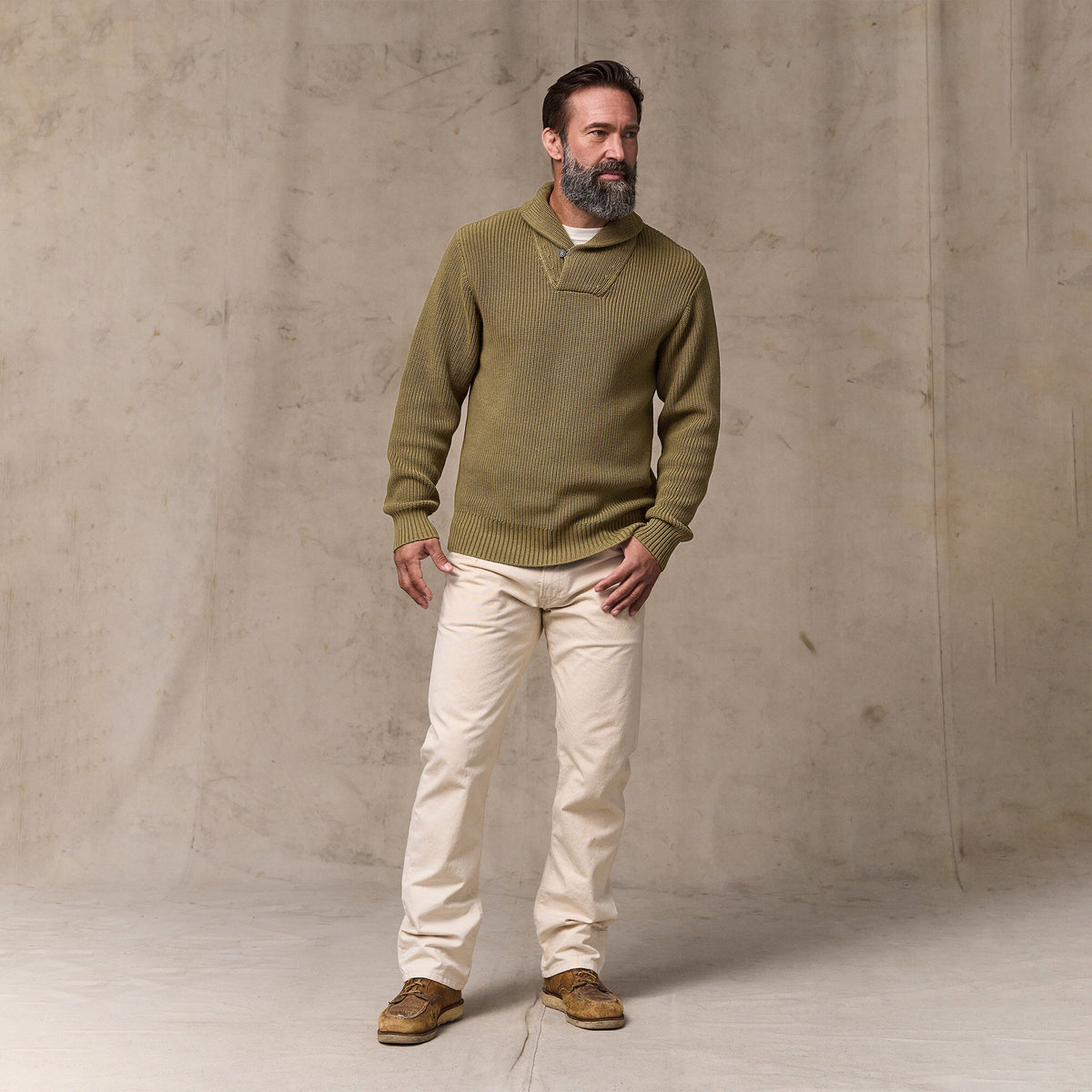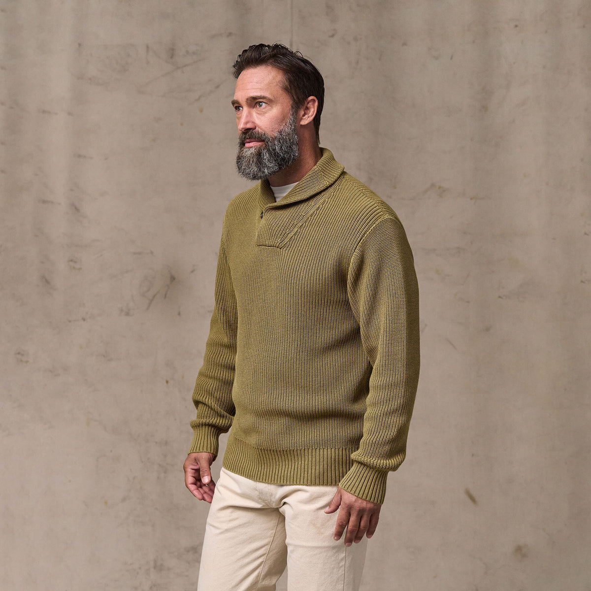 Ce pull intemporel à col châle offre une chaleur respirante par temps frais. Le col châle peut être relevé pour plus de chaleur au niveau du cou. Les fils de jauge 7 sont travaillés en côte perlée qui est à la fois ajourée et souple. Poignets et ourlet en point de côtes 2 x 2. Vêtement lavé en pièce pour une sensation de vêtement déjà porté dès le premier jour, avec un aspect vintage unique à chaque pull.