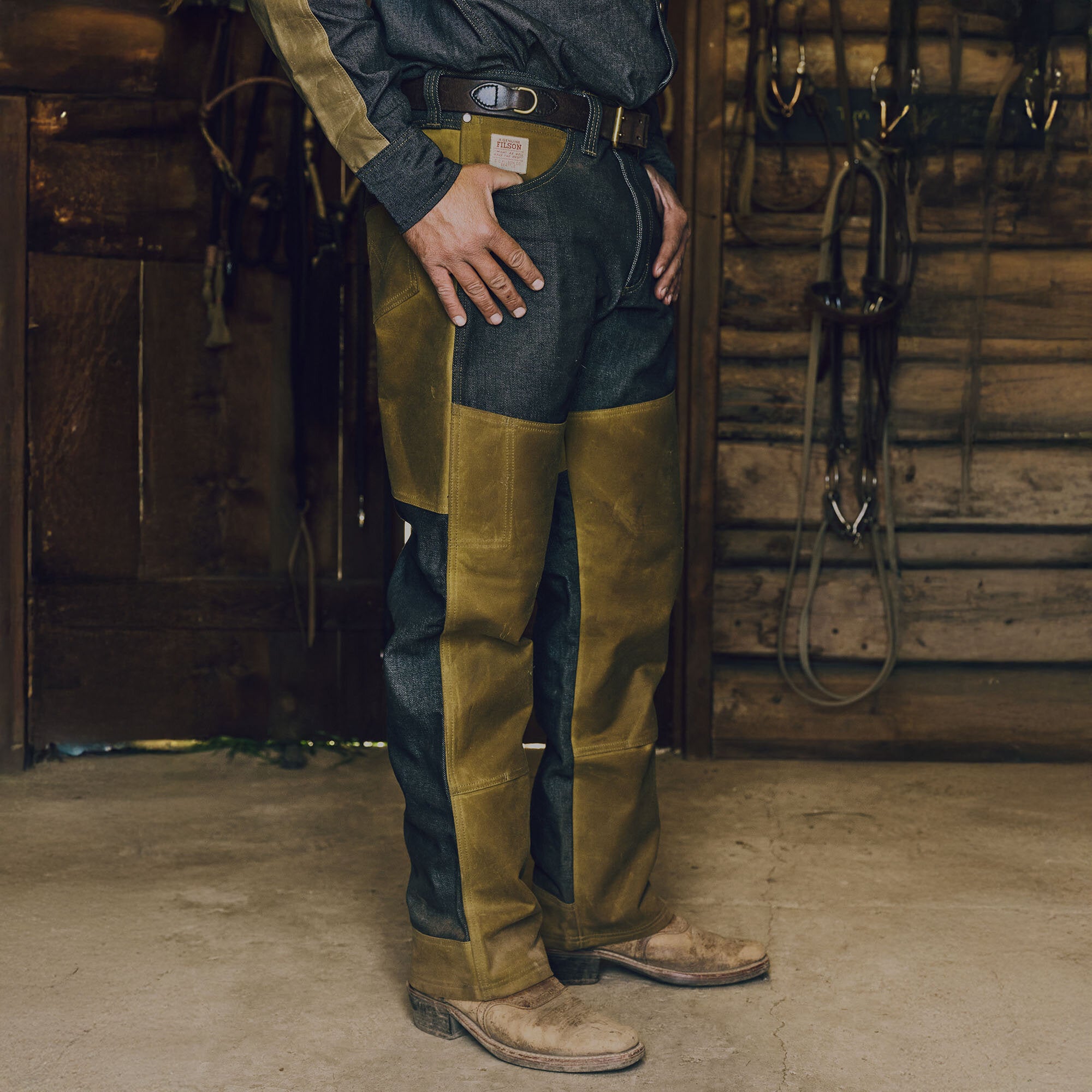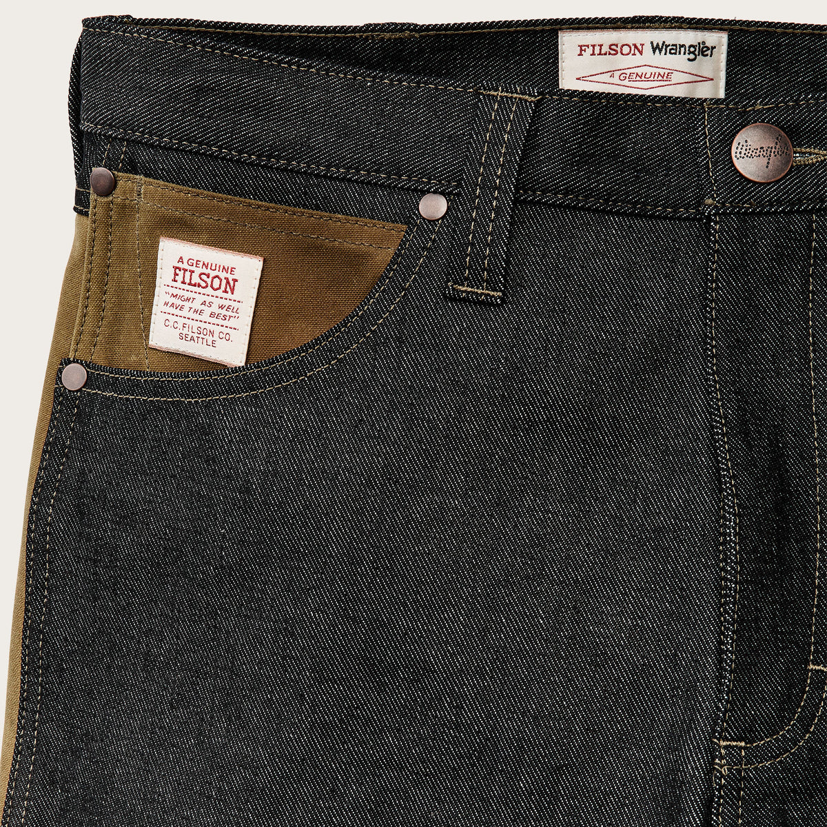 Ce jean de travail authentique est conçu pour les travaux difficiles et les conditions humides. Il est fabriqué en denim Wrangler de 411 g, robuste et à l’épreuve du temps, et renforcé avec notre Tin Cloth pour une résistance à l'eau et une durabilité accrue. Les renforts combinent des éléments de conception de nos pantalons emblématiques Double Tin et Brush – l’assise, les ourlets arrière, l’avant des jambes, tous doublement recouverts de notre toile cirée emblématique. La coupe est décontractée avec un entrejambe à soufflet pour une aisance de mouvement confortable. Un septième passant de ceinture au centre du dos empêche l'affaissement de la ceinture. Poches-revolver ouvertes et recouvertes d'un rabat. Braguette à glissière.