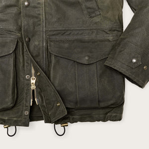 Questa field jacket è realizzata con un unico pezzo di tessuto sulle spalle in modo da eliminare le cuciture e garantire la massima protezione dall’acqua. Sia il colletto che le tasche scaldamani posizionate in alto sono foderate in lana Mackinaw per garantire un calore ineguagliabile anche in condizioni di pioggia intensa. Le grandi tasche espansibili sul davanti permettono di trasportare senza problemi una scatola di cartucce di calibro 12 e sono dotate di divisori interni per tenerle in ordine. Sulla schiena è presente una tasca ad accesso laterale con cerniera foderata in nylon rivestito, utilizzabile come carniere o per riporre guanti, sciarpe o berretti nei momenti in cui non si è impegnati con la caccia. Chiusura frontale con zip a due vie e patta antipioggia. Compatibile con le fodere Filson disponibili separatamente.