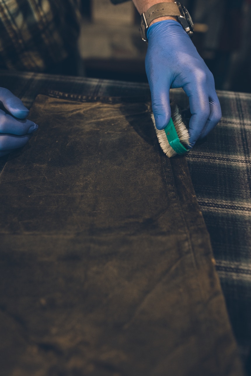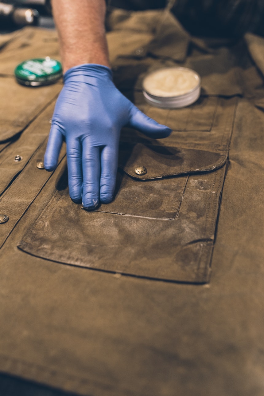 1. Clean all dirt and debris from garment. Waxed cotton can be hosed off and allowed to dry at room temperature before re-waxing. If dirt is dry and caked onto the garment, a stiff nylon-bristled brush works well to remove the debris. Be sure to pay special attention to the seams as these areas can trap mud and dirt.