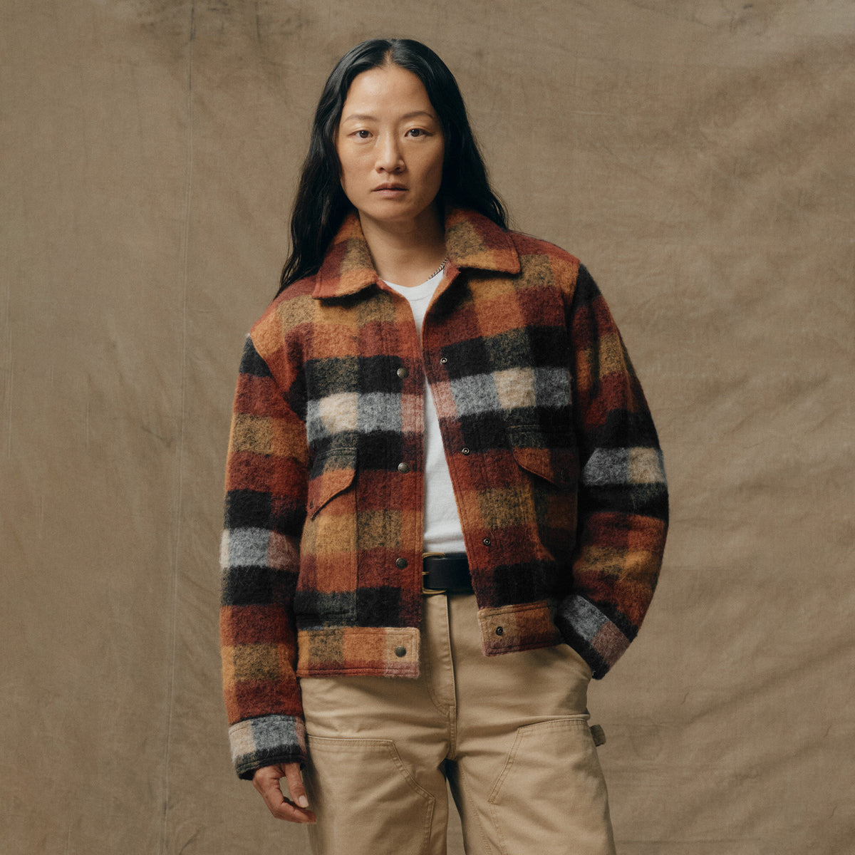 A straightforward design modeled after our vintage wool work jackets. The thick blanket-weight wool is blended with 18% cotton and heavily napped for softness. Fully lined with cotton in the body and easy-layering polyester in the sleeves. Combination hand/snap-flapped pockets. Snap-close front and cuffs. Waist-length cut.